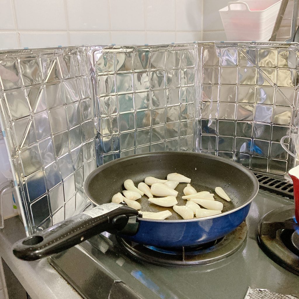 そうそう、前回のブログで紹介したダイソーのガスレンジガードを使っていますよ。油はねをガードできていい感じです(*^▽^*)