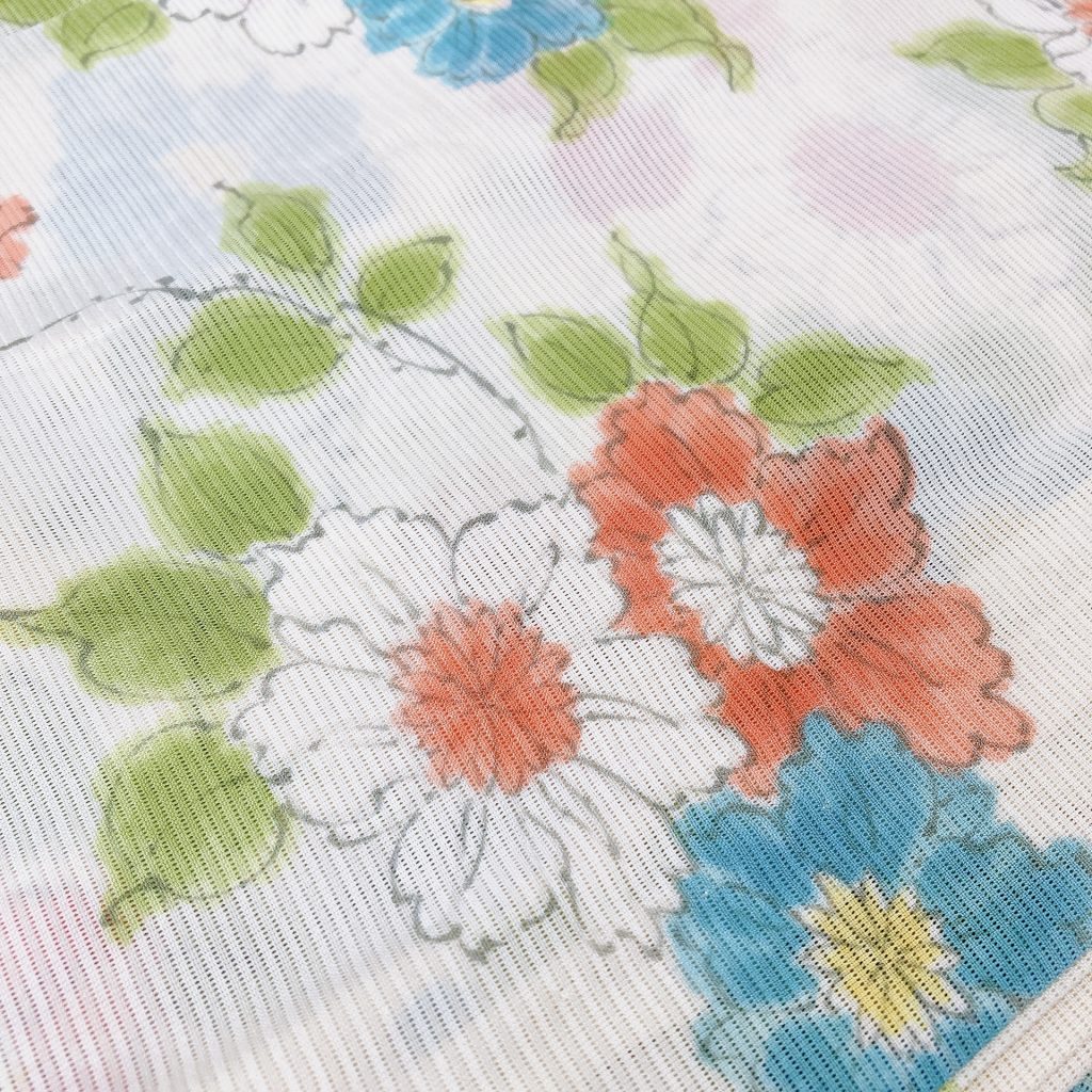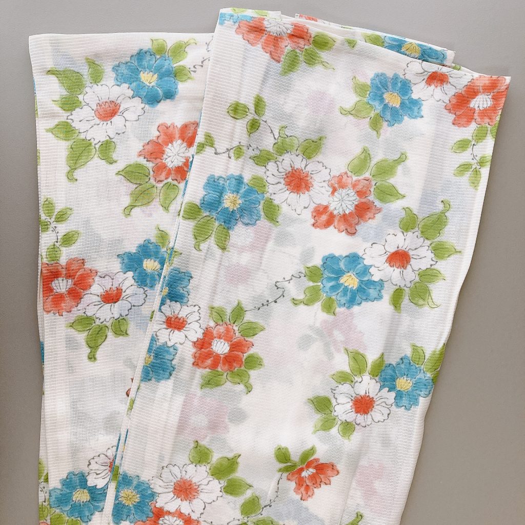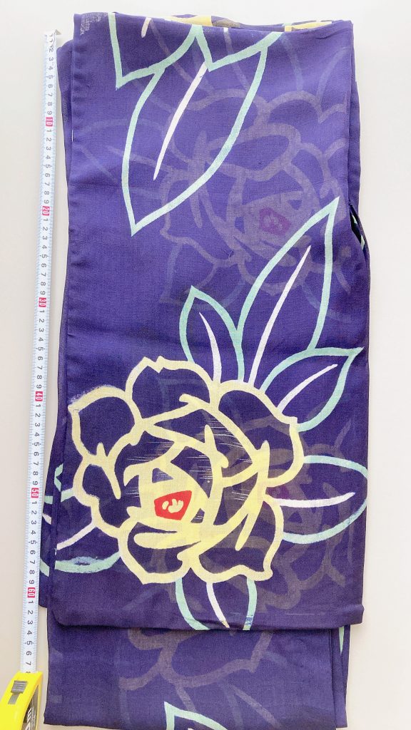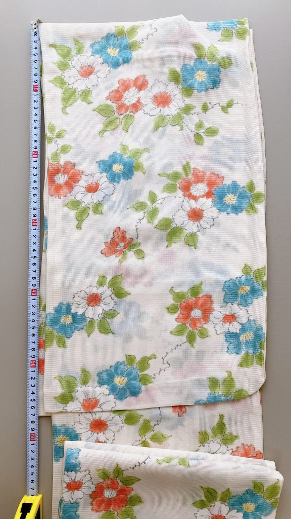着古した感もさほどなく、昔の着物にしては綺麗に保管されていたようです。麻と絹の混合で透け感がとても涼し気な紗の着物です。私は身長が161.5㎝あるので大きい柄も違和感なく着こなせそうに感じました。袖丈が63㎝と長めですが、絶対に切らずに着たい。切ったらせっかくのバラが隠れちゃうから。長襦袢の袖丈と合いませんが諸々工夫して着ます。透けて『長さ違う~』って思われてもいい!着たいから♡自己満の世界(・∀・)